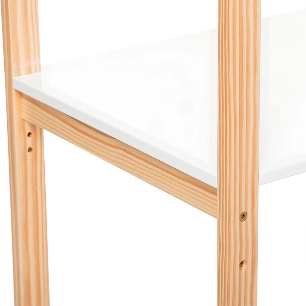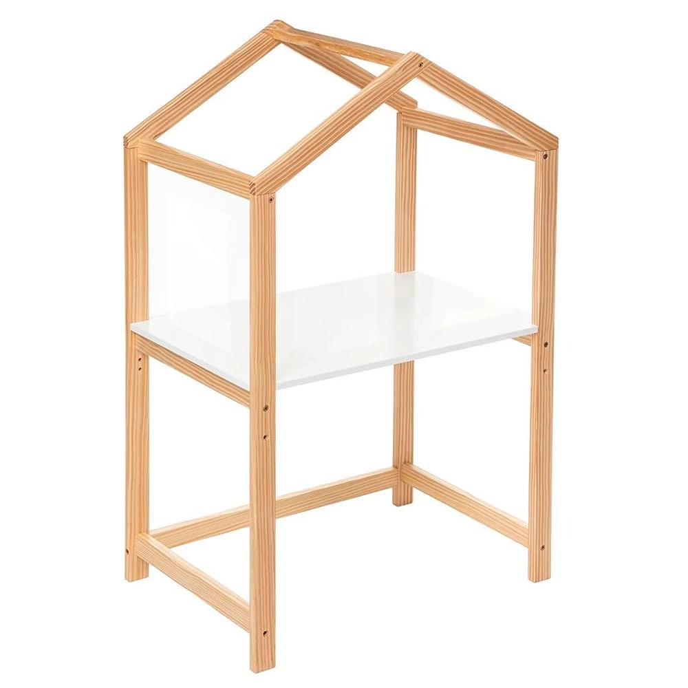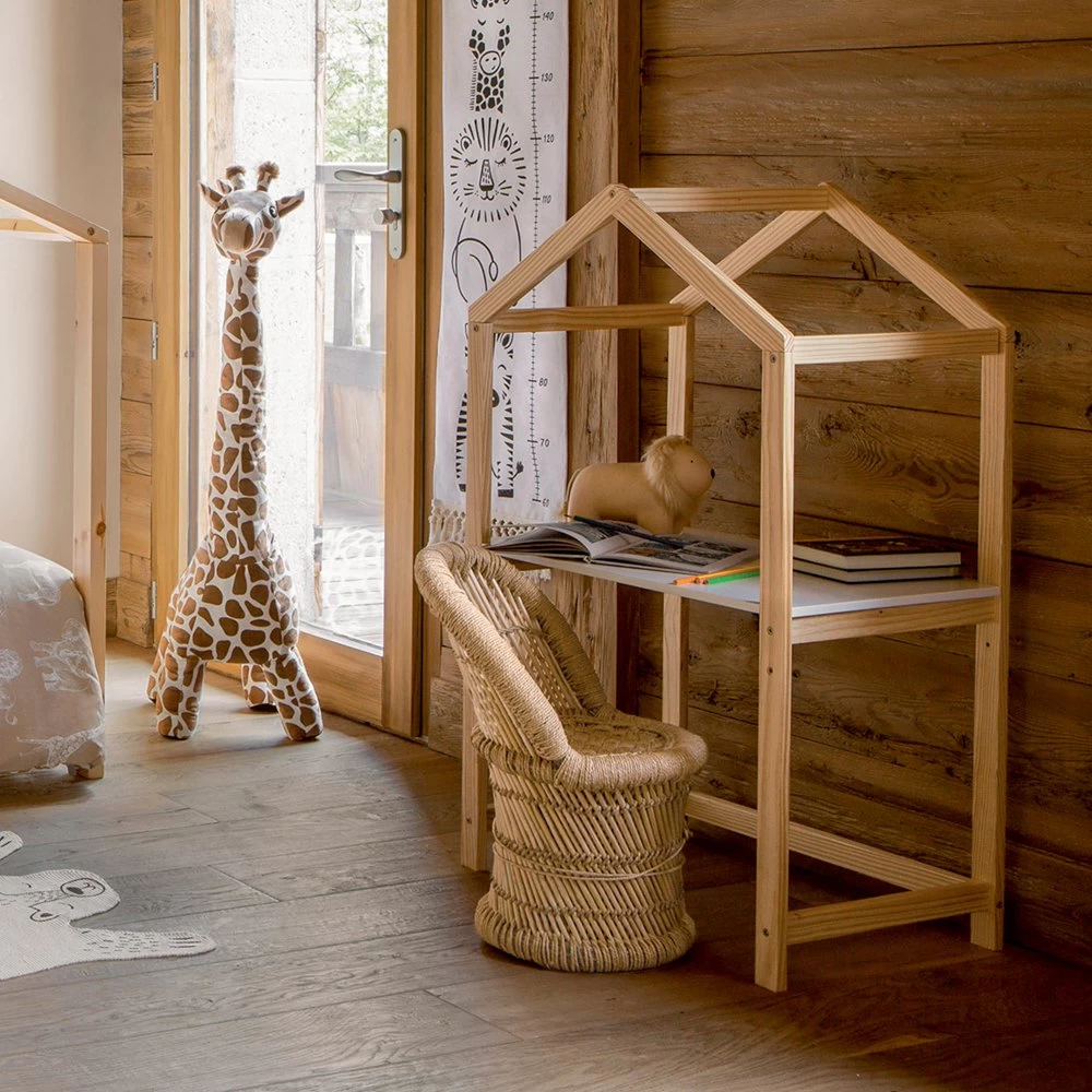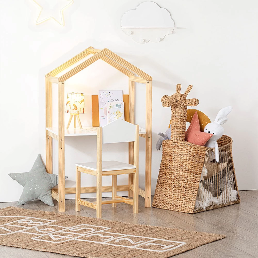 Con forma de casa, este escritorio de pino y fibras de madera tiene un estante que invitará a tu hijo a dibujar, jugar o hacer manualidades.