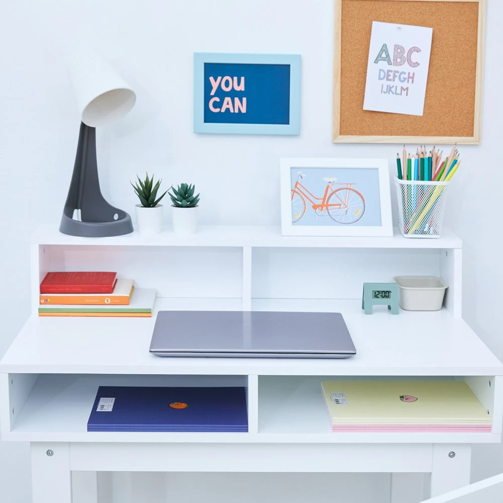 El escritorio estilo escritura de madera blanca Fantasy Fields by Teamson Kids y un escritorio blanco a juego para estudiar en casa y hacer manualidades ofrece el lugar perfecto para horas de lectura o escritura. ¡Dos lugares de almacenamiento en la parte superior ofrecen espacio para blocs de notas, útiles escolares, parlantes y más! ¡Dos compartimentos debajo del escritorio esconden libros, dispositivos electrónicos y otros elementos esenciales! Este escritorio para niños cuenta con un diseño limpio y moderno en color blanco que le permite adaptarse a cualquier decoración en el dormitorio o la sala de juegos de sus hijos. Construido con madera resistente y ecológica, este escritorio está diseñado para durar, y sus superficies fáciles de limpiar hacen que limpiar todos los derrames sea muy fácil.