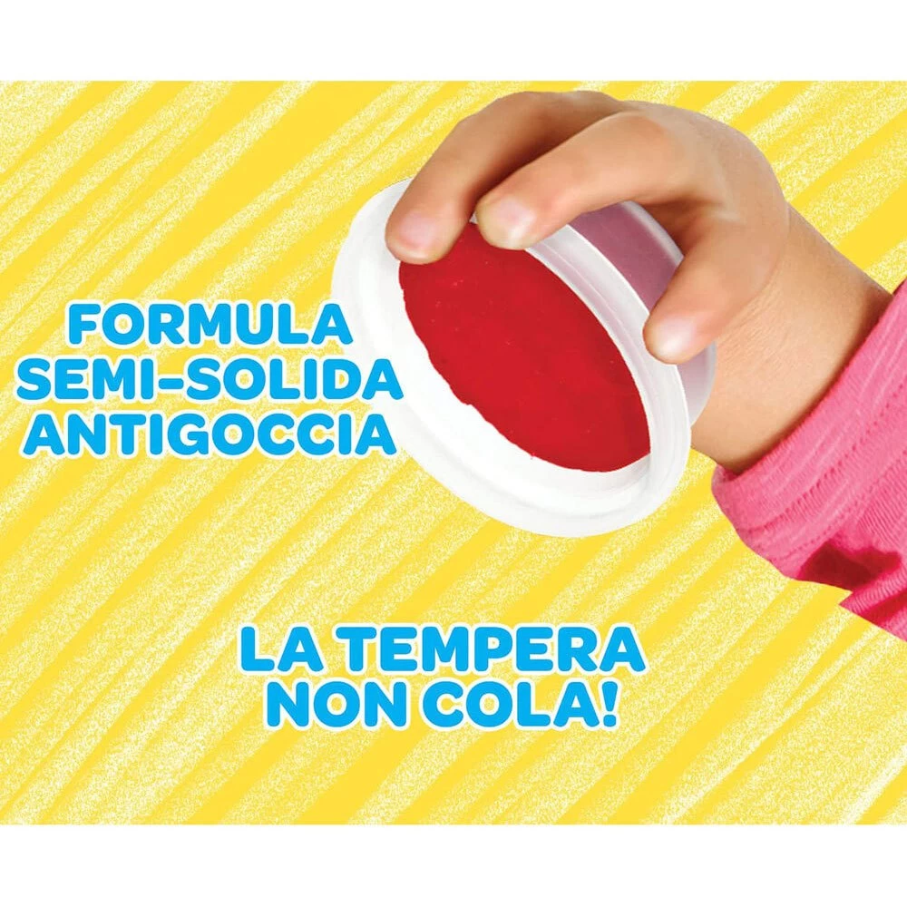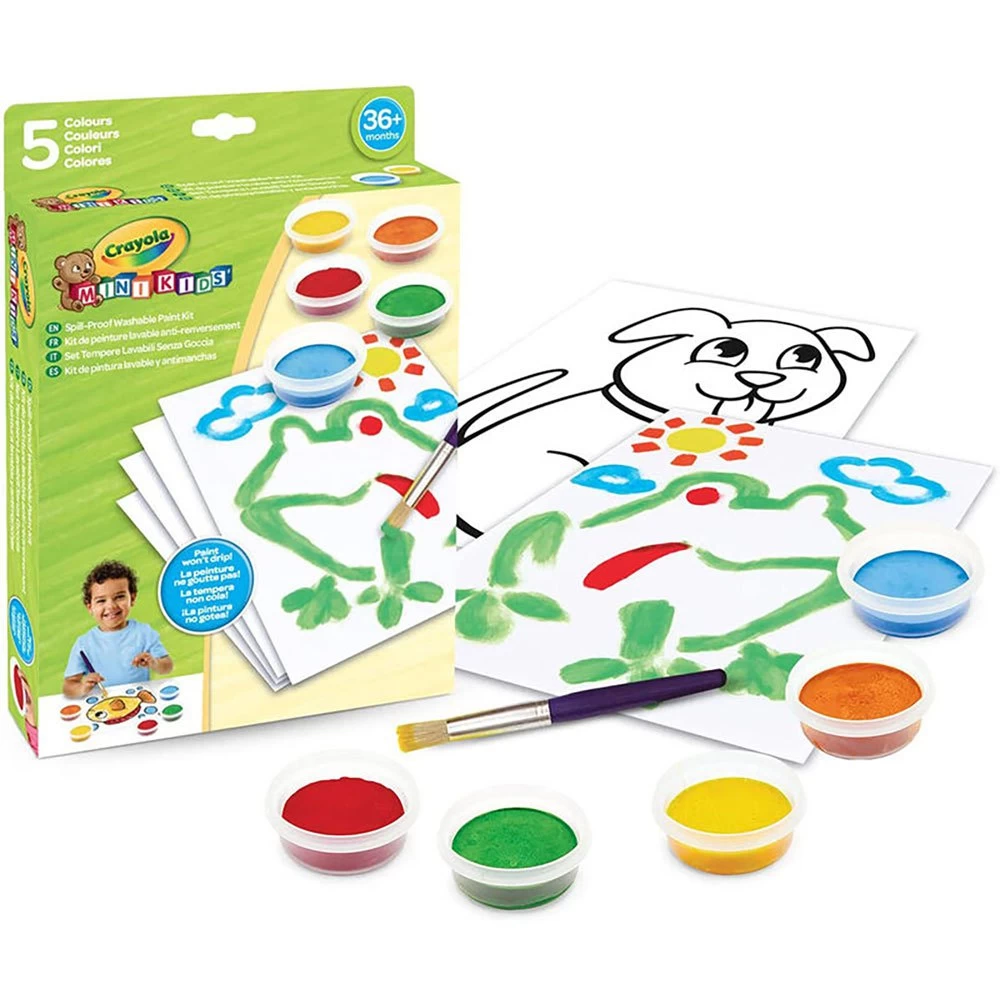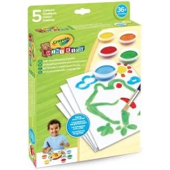 Contenido: 5 pinturas lavables antimanchas, 1 pincel, 20 hojas de papel (10 blancas y 10 con dibujos).