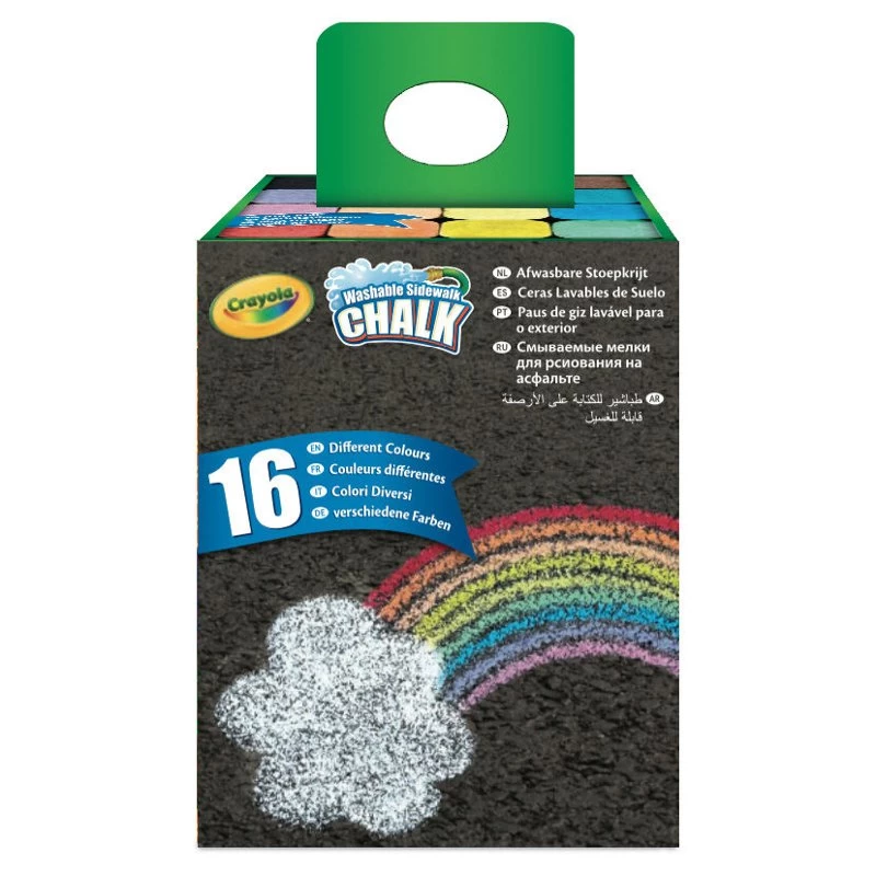 Crayola Set que contiene 16 tizas de suelo de colores para dibujar en el exterior y crear tus obras en aceras, muros, patios, etc…Tienen forma cuadrada para evitar que rueden y son lavables ya que se retiran fácilmente con agua.