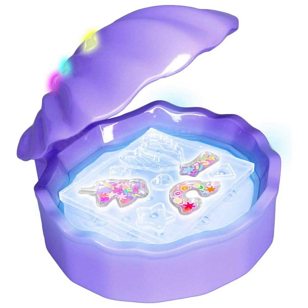Incluye la ´´concha mágica´´ con temporizador de estrellas con luces, bote de 25 ml de gel mágico, 2 moldes, 1 pulsera de plata, 2 clips de pelo, 1 par de pendientes, 1 bolsa de anillas, decoraciones de 3 estilos variados y una herramienta para mezclar.