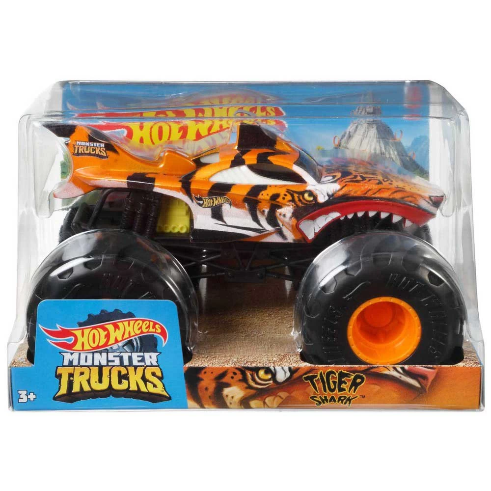 Hot Wheels® Monster Trucks Surtido de fundición a escala 1:24 para niños de 3 4 5 6 7 8 años de edad, gran camión de juguete de regalo de cumpleaños con ruedas grandes para estrellar y aplastar los Monster Trucks de Hot Wheels® Camiones de fundición a escala 1:24 ¡Son los camiones más malos jamás construidos para la competencia y el dominio definitivo! ¡Listo para enfrentarse en batallas cara a cara con su cuerpo de gran tamaño y ruedas gigantes! Cada paquete de camión incluye estadísticas divertidas para cada camión monstruo, incluido el nombre, el tipo de camión, la fuerza, el ataque de choque único y la variación del motor para una gran diversión narrativa. Cada uno se vende por separado, sujeto a disponibilidad. Los colores y las decoraciones pueden variar.