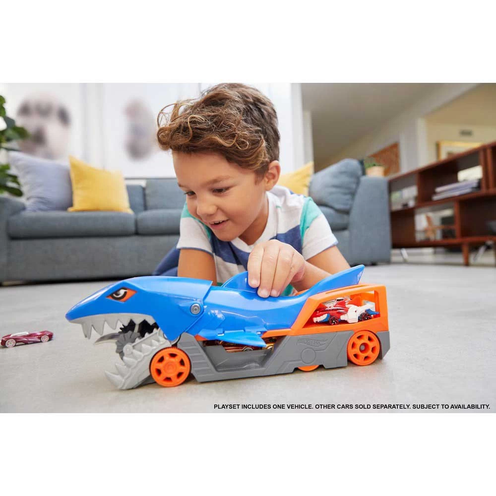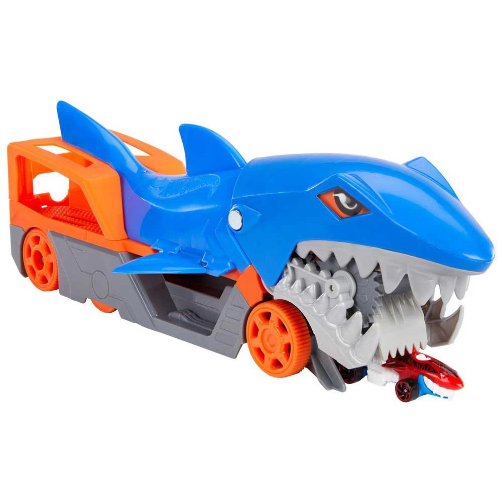 El set de juego Hot Wheels® Shark Chomp Transport reinventa el icónico auto Shark Bite ™ Hot Wheels® como un nuevo y genial transportista.