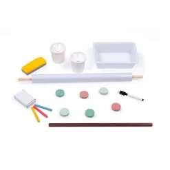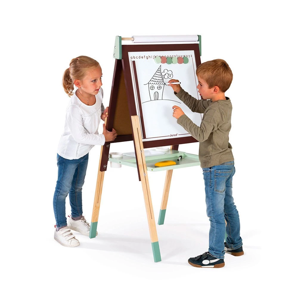 Una pizarra magnética para rotuladores borrables y una pizarra. Varios accesorios: 6 imanes, 10 tizas, 1 rotulador borrable en seco, 1 rollo de papel, 1 borrador de pizarra y 1 regla magnética. Altura ajustable (91 a 126 cm 35,8 a 49,6 pulg.). Superficie de escritura: 47 x 47,5 cm (18,5 x 18,7 pulg.). Muy conveniente: la pizarra se pliega para un fácil almacenamiento. Madera: MDF (pizarra), madera de pino (marco, imanes, estante verde, regla), plástico (vasos, borrador, bolígrafo).