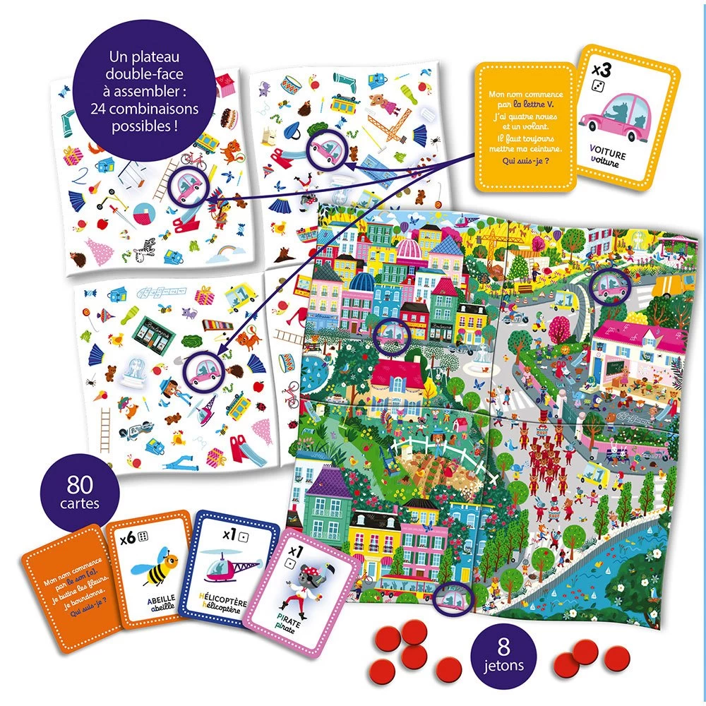 Contenido: 1 tablero de juego de doble cara, 80 cartas, 8 fichas.