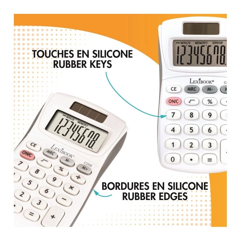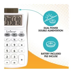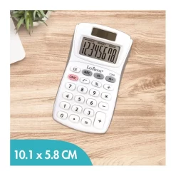 Calculadora de bolsillo 8 cifras con funciones de cálculo clásicas y avanzadas (memoria, porcentajes, raíz cuadrada). Gran pantalla de 1 línea con 8 dígitos fáciles de leer.