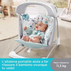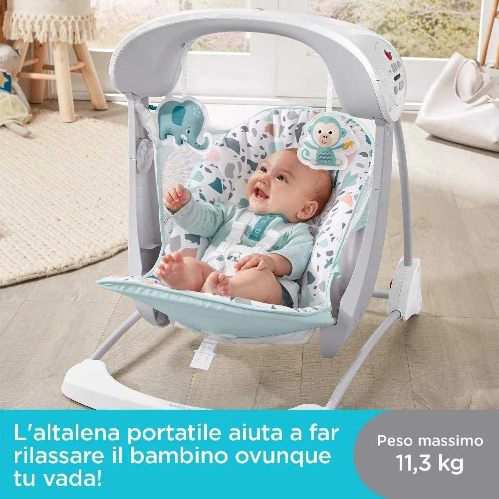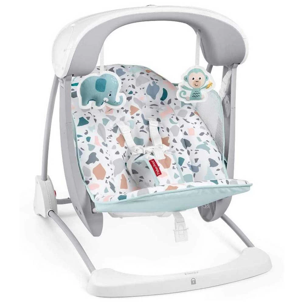– Este columpio para bebé de Fisher-Price también viene con 2 peluches colgantes de animales para que el bebé se enamore.