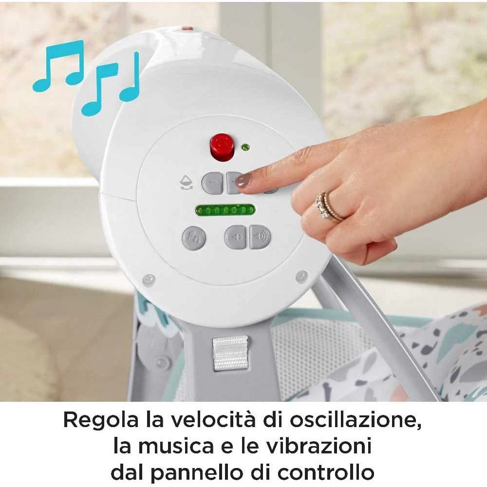 – La mecedora para bebé se puede girar a 6 velocidades diferentes y también cuenta con 10 canciones relajantes y sonidos de la naturaleza (todas con volumen controlable).