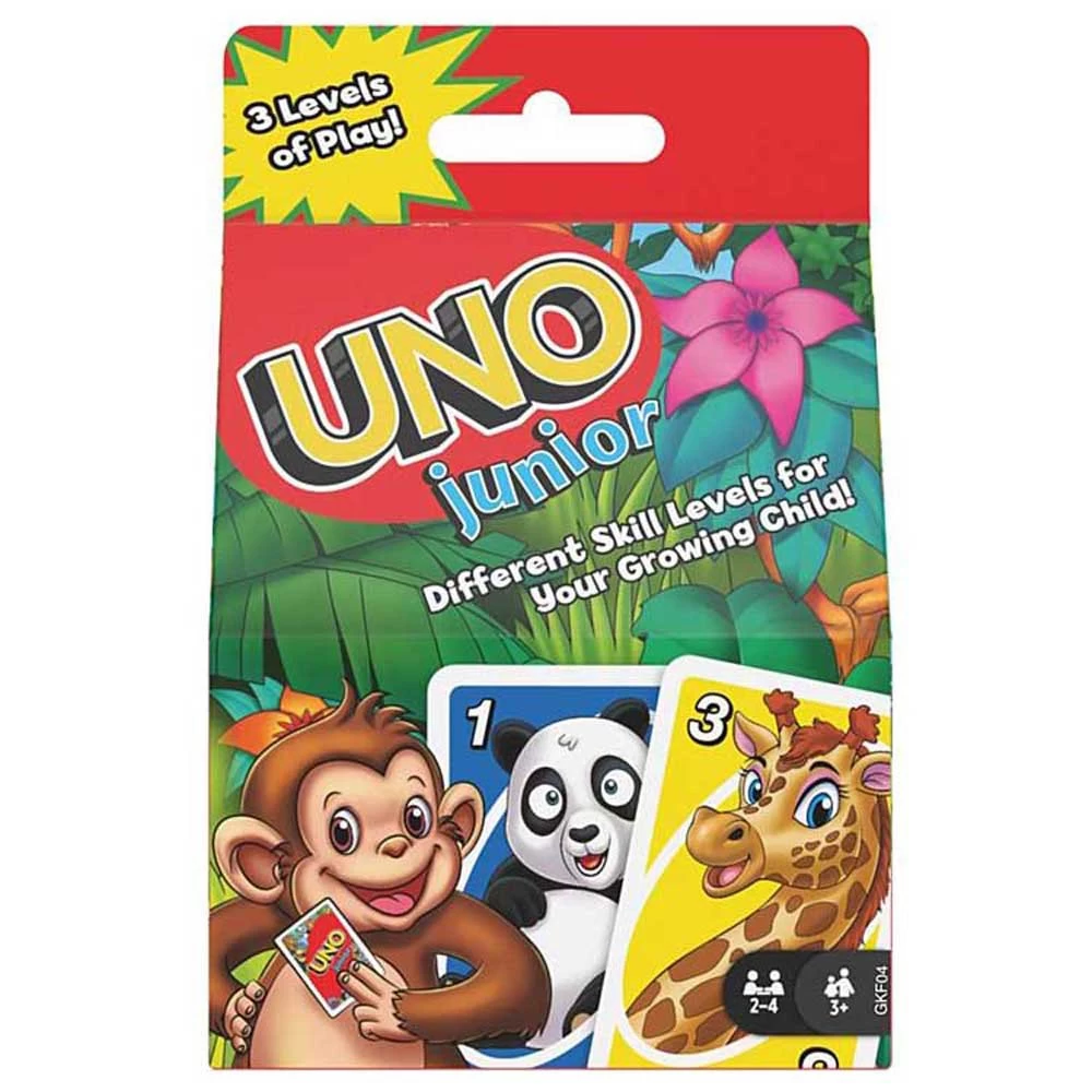 Este juego de cartas UNO® simplificado para jugadores más jóvenes tiene múltiples niveles de juego para que los niños puedan crecer con el juego.
