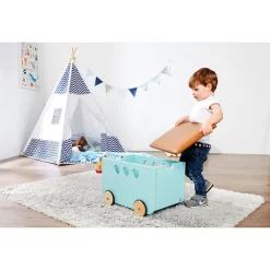 El baúl de juguetes Jim de Pinolino proporciona espacio suficiente para guardar los juguetes favoritos de tu hijo en poco tiempo, y también se puede usar como banco. Gracias al práctico cable de tracción y las ruedas de madera de goma, los niños pueden llevar sus juguetes a cualquier parte. La tapa es extraíble y tiene una capacidad de carga de hasta 20 kg. Con una tapicería de piel sintética en la tapa, este cofre de almacenamiento también proporciona una cómoda superficie para que los pequeños exploradores se sienten antes de sumergirse en su próxima aventura. Con la combinación de azul menta y marrón, la caja de juguetes está a la moda y llamará la atención en cualquier habitación infantil. Color: Azul menta y marrón Material: MDF lacado y piel sintética (100% PU) Dimensiones: 50 x 36 x 36 cm (largo x ancho x alto) Con cordón de tirar Ruedas de madera recubiertas de goma Tapa extraíble Capacidad de carga: 20 kg Recomendado para niños mayores de 3 años Fácil montaje Cordón largo. ¡Riesgo de estrangulamiento! Se puede limpiar con una gamuza seca o un paño de algodón ADVERTENCIA: No apto para niños menores de 36 meses. ADVERTENCIA: Sólo para uso doméstico. ADVERTENCIA: Debe ser usado bajo la supervisión directa de un adulto.