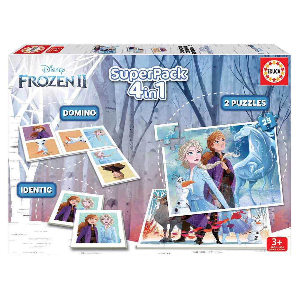 Frozen II Superpack 4 en 1 es unua caja llena de diversión y educación con múltiples posibilidades de juego para jugar solo o acompañado contiene 2 puzzles de 25 piezas, 1 juego de memoria de 24 cartas y 1 domino de 21 piezas , todas decoradas con dibujos de los personajes de Frozen II a todo color.