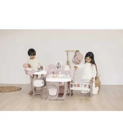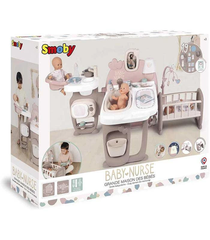 – Se incluyen numerosos accesorios para acompañar las diferentes zonas de juego: 1 cazo, 1 plato, 1 cuchara, 1 biberón, 1 cepillo de dientes, 1 tarro de papilla, 1 termómetro mecánico, 1 jabón de manos en espuma, 1 ducha de acción mecánica, 1 caja de tiritas con tiritas, 1 bote de talco y 1 cuadernillo para aprender a cuidar a un bebé