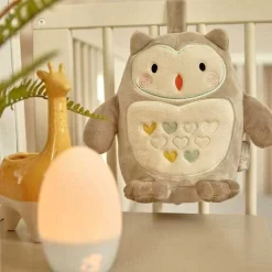 ¡El compañero perfecto para dormir! tocando 4 sonidos reconfortantes (latidos del corazón, lluvia, ruido blanco estático o canción de cuna de Brahms) y con una barriga suave y cálida y resplandeciente, el búho ollie crea un ambiente agradable y relajante para que tu bebé se quede dormido. El sensor de llanto incorporado escucha inteligentemente y se reactiva para ayudar a mantener la calma en caso de que se mueva.