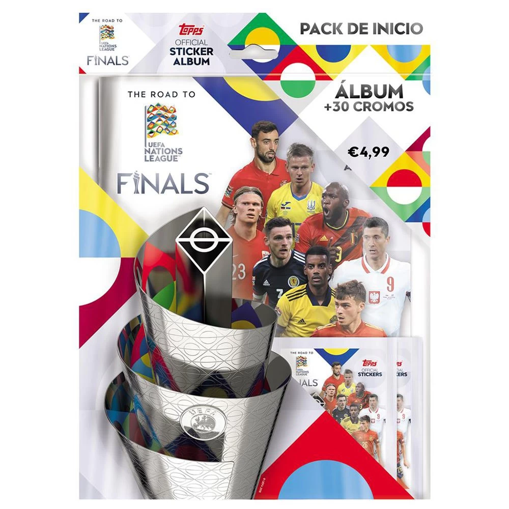 Incluye álbum con 6 cromos insertados y 3 sobres de cromos (con 8 cromos cada uno).